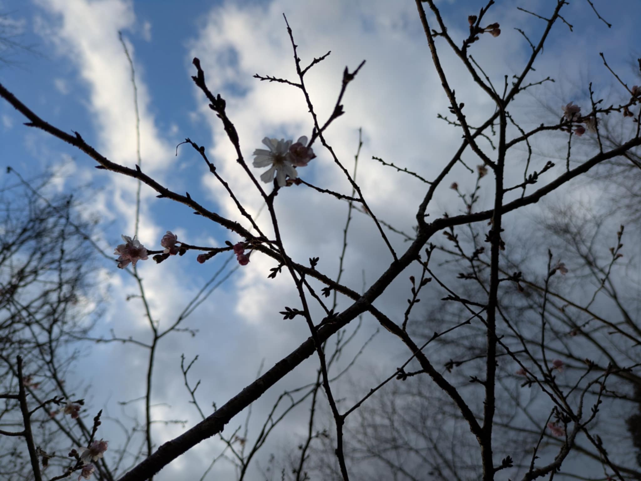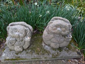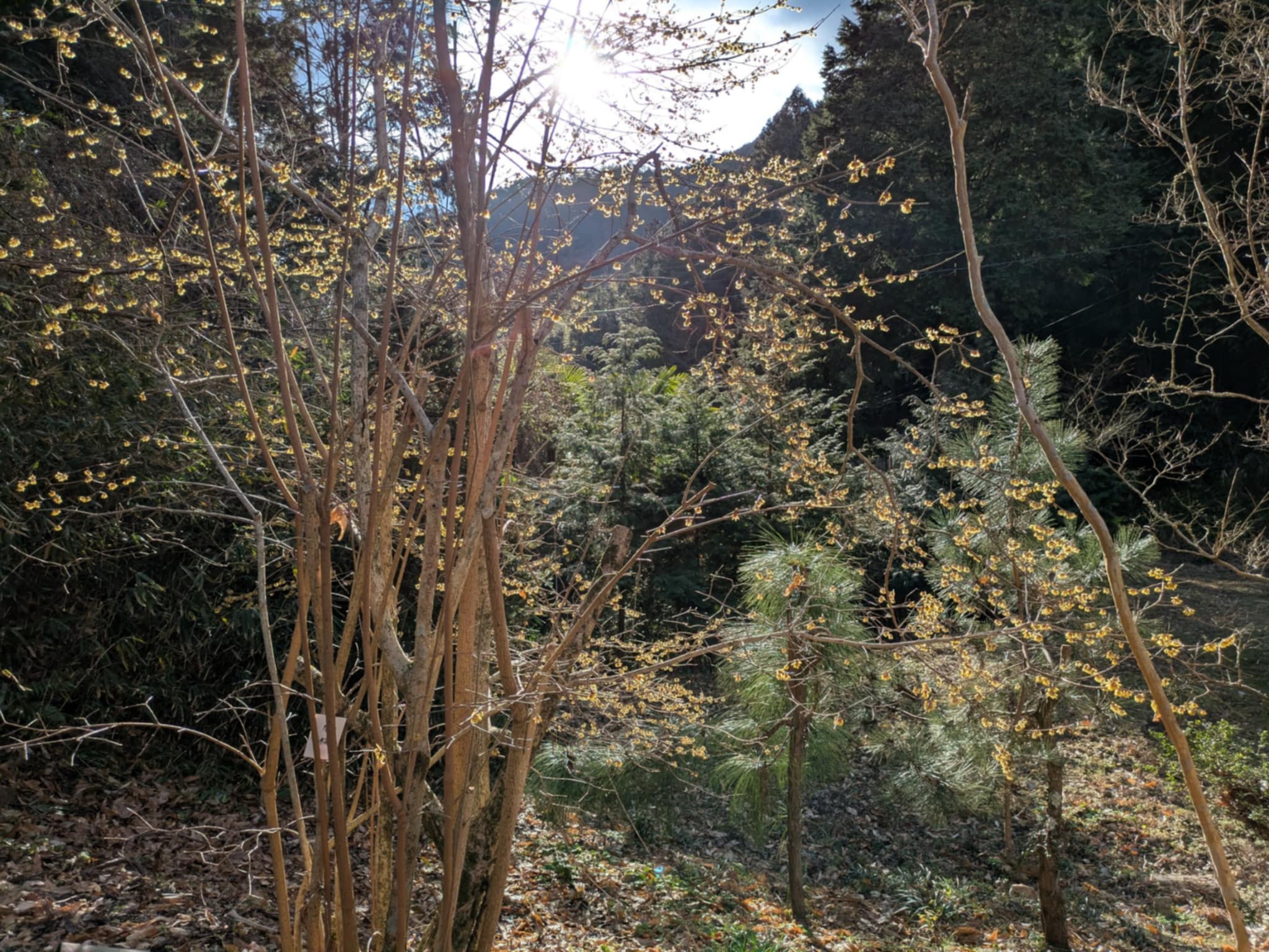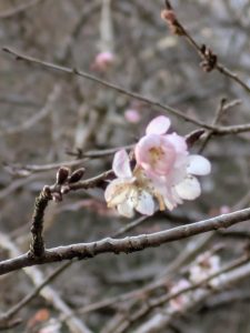 こんな寒い季節だからこそ、愛でられる花もあります。駐車場の端の方、冬になりますと、たぬきさんのそばにはスイセンの花、そのまま少し左に移動すると「十月桜」の木がかわいらしい花をつけ、その隣では、黄色の「蠟梅」の花が咲き、近づくととても良い香りがします。