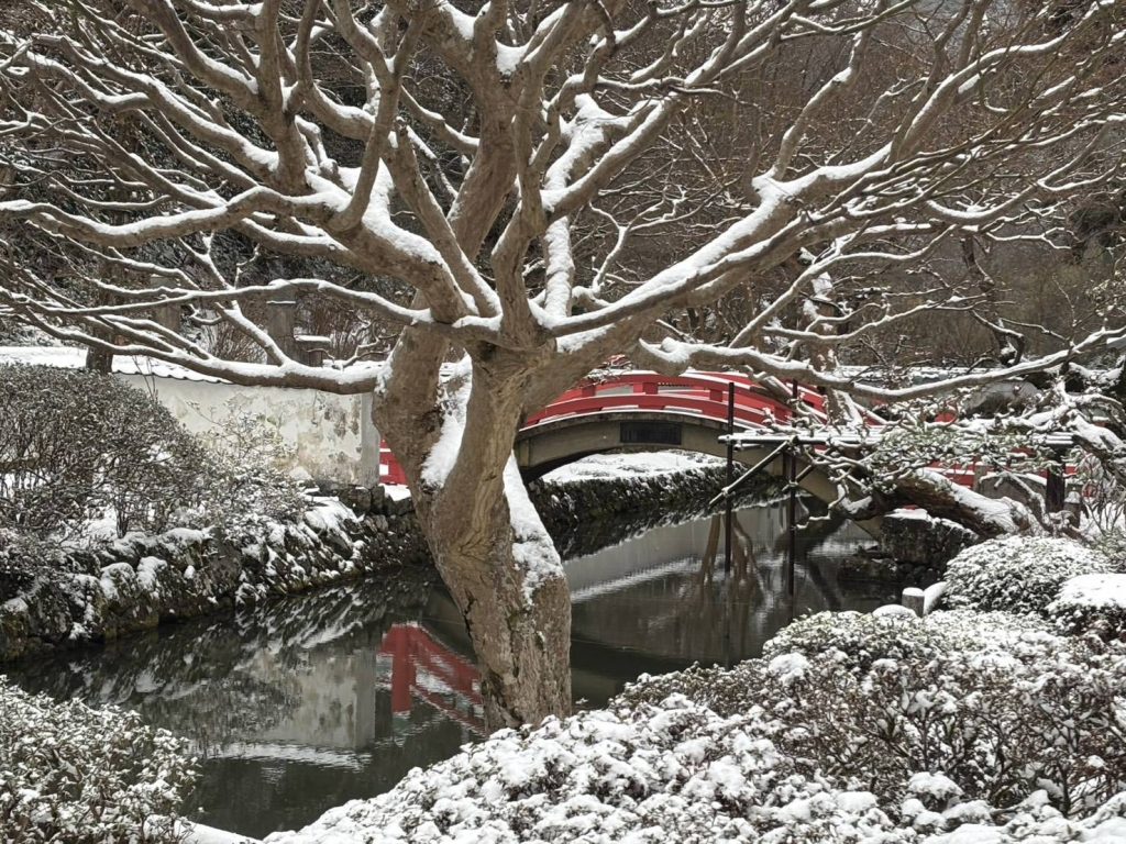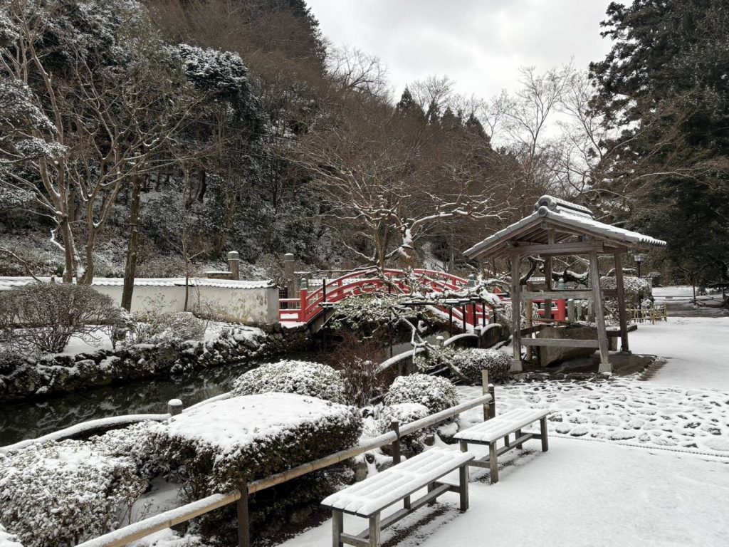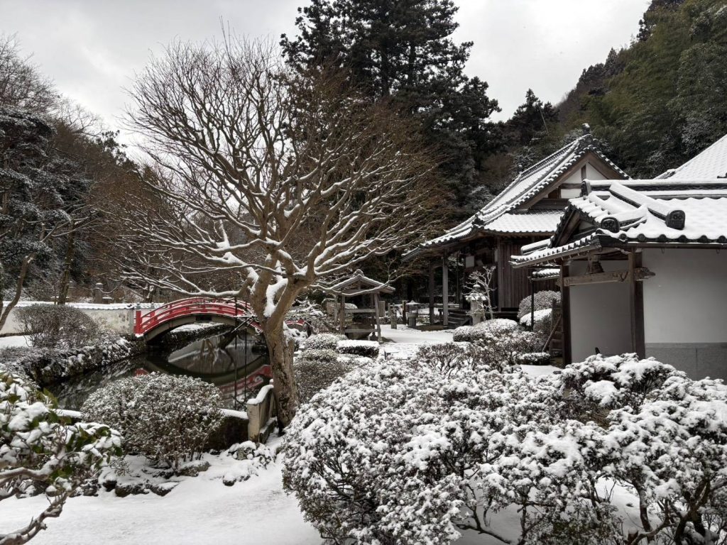 さて、この週末は冷え込みましたね。山頂にある当寺院も、少しですが雪が積もりました。↓2月8日朝の写真です。